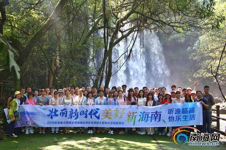 全国网媒海南行采访团在临高古银瀑布合影留念。南海网记者 李昊 摄