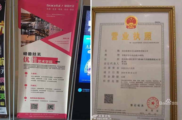 华商论坛网友“一叶舟儿”发帖求助,称自己孩子在格蕾丝芙优雅艺术学院曲江店试听了一节钢琴课后觉得还可以,就在11月17日交了一万多的培训费,总共72节课,当时在微信上支付了全部培训费。