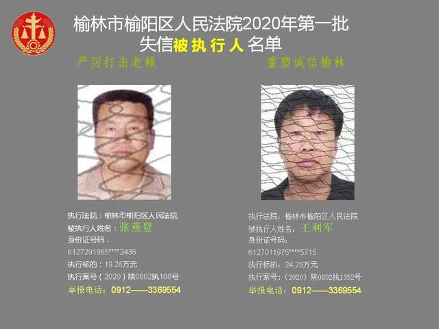 7月28日,榆林市榆阳人民法院公布2020年第一批失信被执行人名单,具体名单如下: