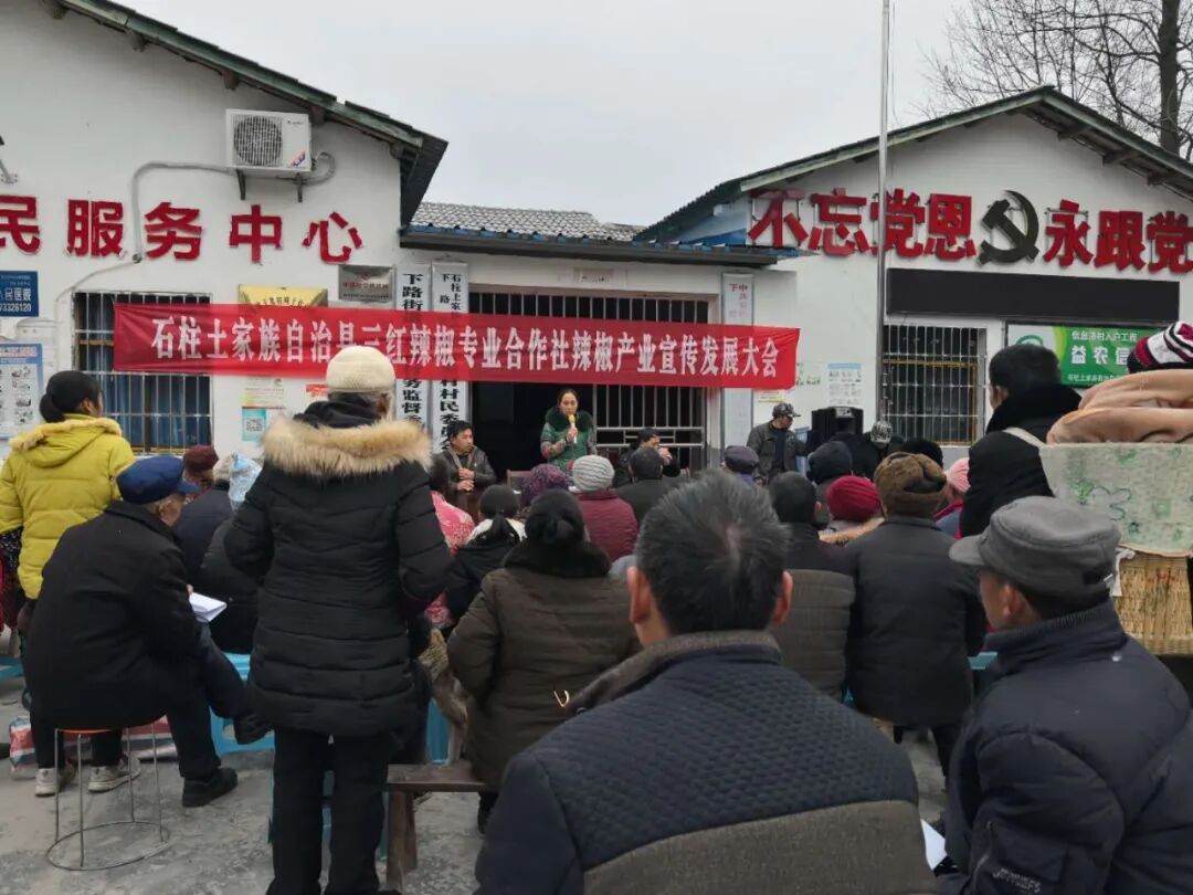 在石柱县脱贫攻坚这场战役中,辣椒产业发挥了巨大作用。为推动辣椒产业发展,谭建兰倡导成立了石柱土家族自治县辣椒行业协会,并被选为会长。“协会成立的目的,是要把大家凝聚起来,心往一处想、劲往一处使,在竞争激烈的市场中形成合力,带动更多人脱贫致富。”“这里我给你讲个真实的故事。”谭建兰告诉记者,椒农们现在已把辣椒专业合作社、辣椒行业协会看成了他们真正的娘家。石柱县六塘乡三坪村中坝组的刘学友,每年种植的辣椒只卖给专业合作社,并对收购人员多次叮嘱,“你们搞收购的要严把质量哈,哪个把厂子(专业合作社、辣椒加工厂)搞垮了,他就是我们的罪人!”谭建兰介绍,确保辣椒产业健康发展,带动椒农脱贫增收致富,是协会参与打赢脱贫攻坚战的“主攻方向”。为此,协会通过会员大会制定了“三个三”服务模式。以“三个协议”服务椒农放心种椒。协会采取与乡镇(街道)签订“基地建设协议”、与椒农签订“种植收购协议”、与贫困户签订“长效增收协议”,解除椒农种椒的后顾之忧。以“三个时段”服务椒农安心种椒。协会通过采取“产前宣传发动、开展技术培训;产中配送农资、开展生产指导;产后保价回收、开展表彰奖励”的实际举措,提高了椒农种椒的积极性。以“三个统一”服务椒农热心种椒。协会做到了“统一农资供应、统一技术指导、统一病虫防治”,解决了椒农购买物资和种植技术的难题。谭建兰出席石柱县三红辣椒专业合作社宣传发展大会。(代表供图)据统计,仅2019年一年,协会带动全县3万多农户,其中包括贫困家庭2700多户,种植辣椒面积突破30万亩,产值达15亿元。同时,为椒农们购买生产物资垫资80余万元、为800余人次进行技术培训、提供优质种苗200万株。“这几年,真的要感谢谭建兰代表。”六塘乡村民张廷树对记者说,因妻子患癌症,家庭经济一下子就垮了,但谭建兰一直鼓励他,帮助他家种植辣椒、蔬菜。现在,张廷树流转承包200多亩土地,每年收入约20万元,逐渐把欠账还上。“我只要有困难,找到了谭代表,她都会尽力帮我想办法,真的不知道说啥感谢的话。”在谭建兰的影响下,很多留守妇女也积极开办辣椒粗加工的微型企业,每一家微企又能带动3到5个劳动力,解决了很大一部分人的就业问题。2019年4月,石柱县成功摘掉“国家级贫困县”帽子。“石柱县脱贫摘帽,也有我们辣椒行业协会的一份功劳。”谭建兰自豪地说。
