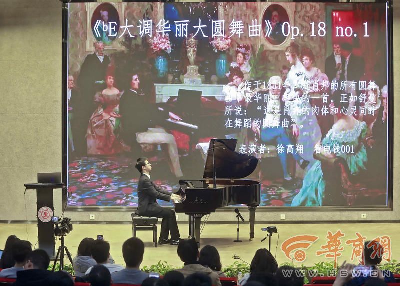 在现场演奏的学生当中,最特殊的、也是全场最为关注的一位就是西安交大钱学森班大一学生徐高翔同学,他在演奏前讲述了自己学琴的经历和感受,以及如何兼顾文化课与音乐的学习。随后他为大家演奏了《降E大调华丽大圆舞曲》,这首圆舞曲是肖邦的所有圆舞曲中最华丽、最轻快的一首,也被称为“是肖邦的肉体和心灵同时在舞蹈的圆舞曲”。徐高翔弹奏出了作品华美的旋律与辉煌的音质效果,赢得了全场观众热烈的喝彩与掌声!