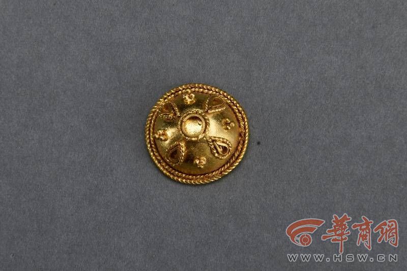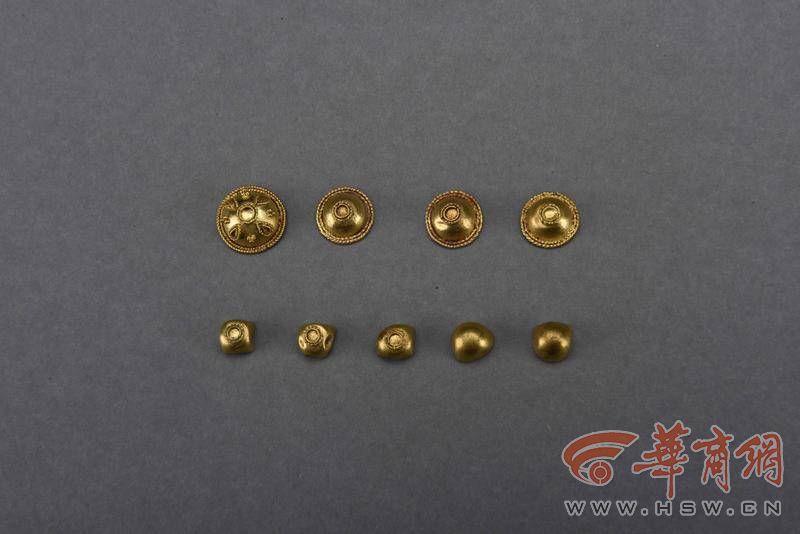 M5内发现的小型金饰出土于墓室内,因墓葬被盗,原初位置已不清楚,但从其大小和背面有扣来分析,应该为衣服上装饰可能性较大,金饰表面有多处焊接的绳索纹和金珠。
