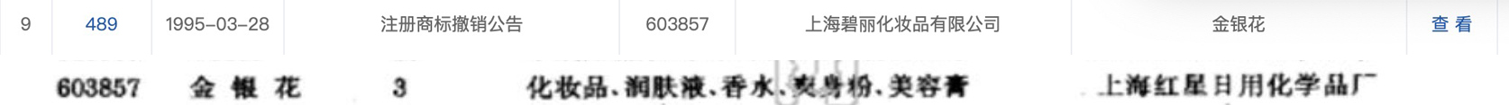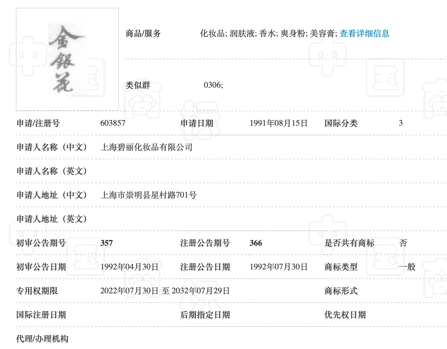 相关裁判文书显示,案外人上海红星日用化学品厂于1992年经核准注册了第603857号“金银花”商标,核定使用在第三类商品上,包括化妆品、润肤液、香水、爽身粉、美容膏。2010年2月8日,碧丽公司经受让取得该商标。