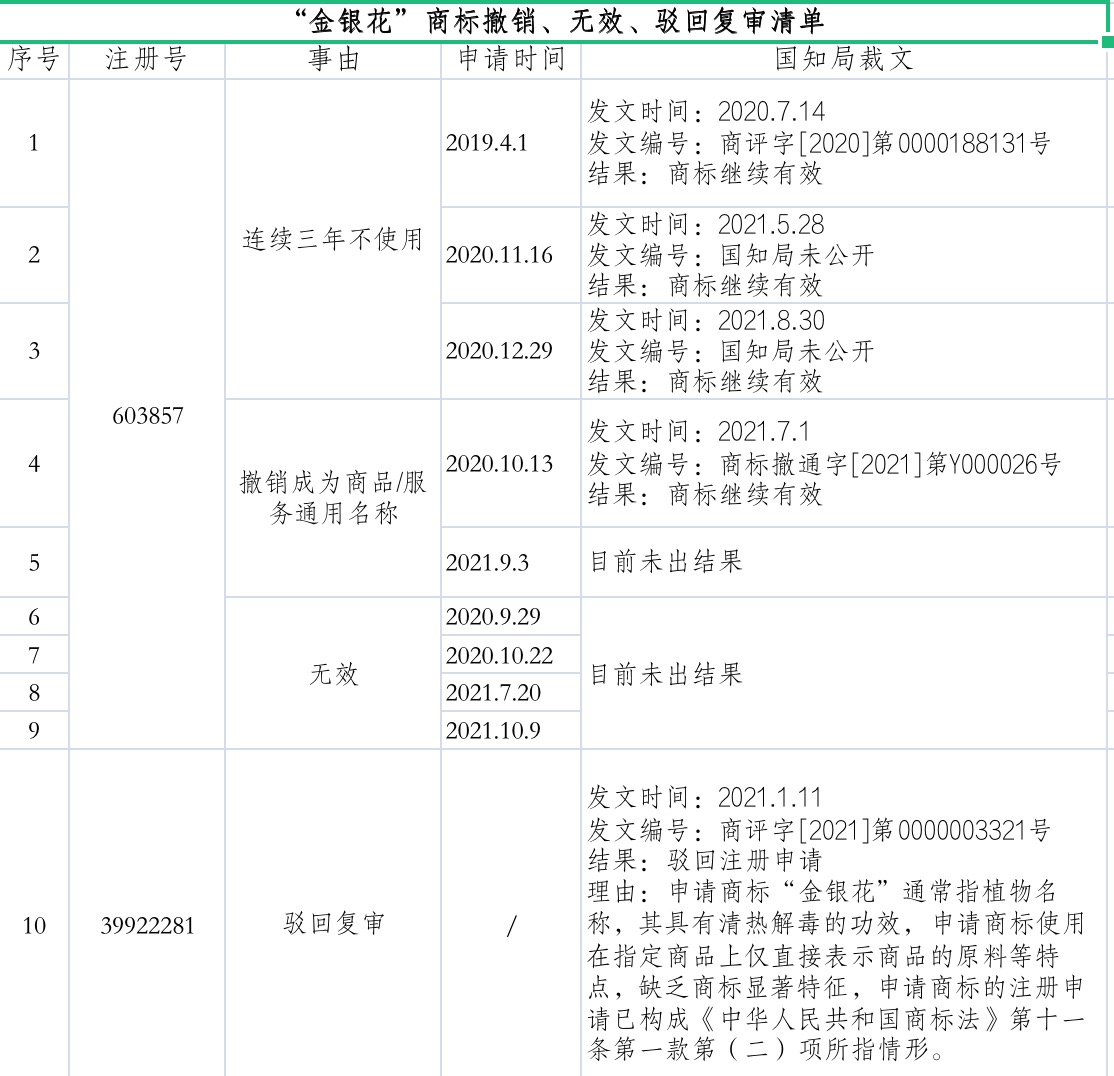 据马式辉团队统计,自2019年4月至2021年10月间,共有5次关于“金银花”商标的撤销商标申请,其中,以该商标“连续三年不使用”(俗称“撤三”)为由的申请有3次;以该商标属于“通用名称”为由的申请2次,这些撤销申请基本被驳回。