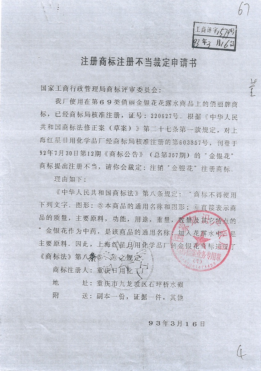 澎湃新闻注意到,上述“金银花”商标撤销档案中,还附有当年撤销该商标的申请书。申请人是重庆日用化工厂,申请时间是1993年3月16日。