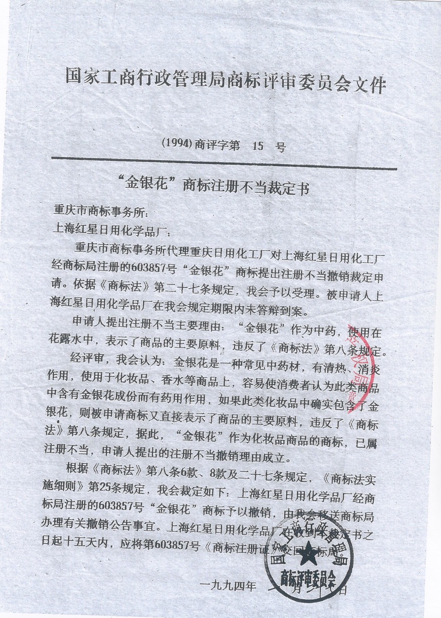 2021年11月,赵智庆律师向江苏高院申请调取证据,随后从国家知识产权局调取到了“金银花”商标的相关档案。其中,一份国家工商行政管理局商标评审委员会的《“金银花”商标注册不当裁定书》显示,上海红星日用化学品厂的603857号金银花商标被予以撤销,并被要求交回《注册商标证》。