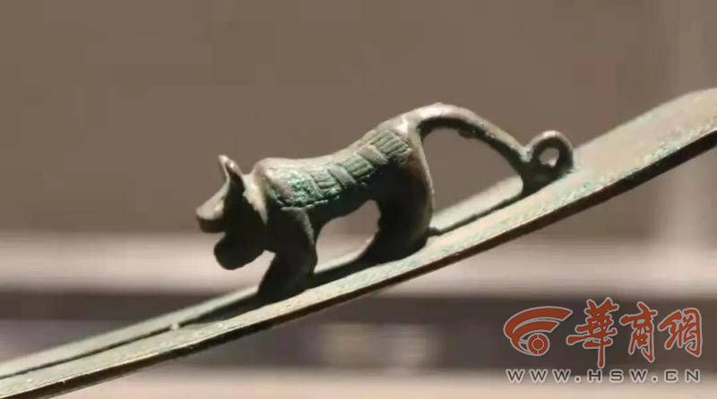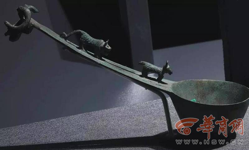 陕西历史博物馆藏有一件商代羊首勺。勺是古代挹酒器,一般和盛酒器配套使用。勺柄上一前一后雕塑着一只小羊和一只小老虎,老虎作扑食状,而羊却浑然不知。这个充满紧张感的瞬间,被雕塑定格成为青铜器上的永恒,具有浓厚的艺术魅力,生动地体现了自然界弱肉强食的情景。