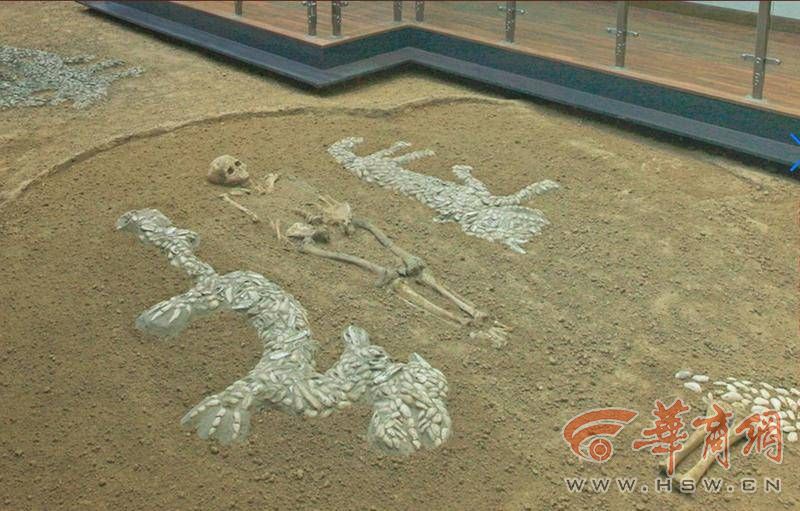 当年8月,考古工作者在发掘西水坡遗址M45墓时有了一个惊人的发现:墓室正中是男性墓主的骨架。在墓主的左右两侧,居然放置着用蚌壳摆着的一套龙虎图案。在人骨的右侧是龙图案,龙的头朝北,背朝西,身长1.78米、高0.67米,做昂首、曲颈、弓身、腾飞状。在人骨的左侧是虎图案,虎的头朝北,背朝东,身长1.39米、高0.63米,做瞪目、张口、垂尾、行走状。在虎图案的西边和北边,还摆着两处蚌壳。西边的蚌壳比较杂乱,北边的蚌壳则呈一个三角形,蚌壳东边还发现两根人的胫骨。在发现第一组蚌塑之后,考古工作者又发现了另外两组蚌塑。第二组蚌塑位于M45墓室南面20米的一个浅地穴中,图案有龙、虎、鹿和蜘蛛等。第三组蚌塑则位于第二组蚌塑南面20米的一条灰沟中,有人骑龙和虎的图案。