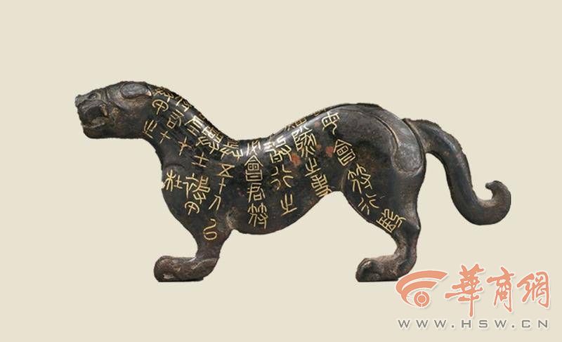 另外,1979年在宝鸡市凤翔县周原出土的一件战国镂空回首金卧虎也呆萌可爱,一改威猛霸气的形象。它长5.2厘米,宽3.3厘米,高3.3厘米,重155克。呈卧虎形,猛虎回首,阔口微抿,巨目宽鼻。目为二孔,大耳上卷,曲身下卧,长尾上卷,通体施珍珠纹与卷云纹,中空,属某件器物上的装饰件。