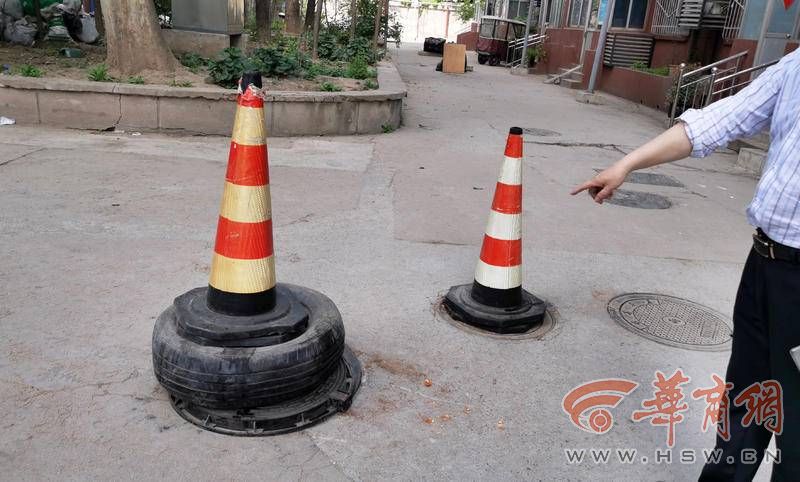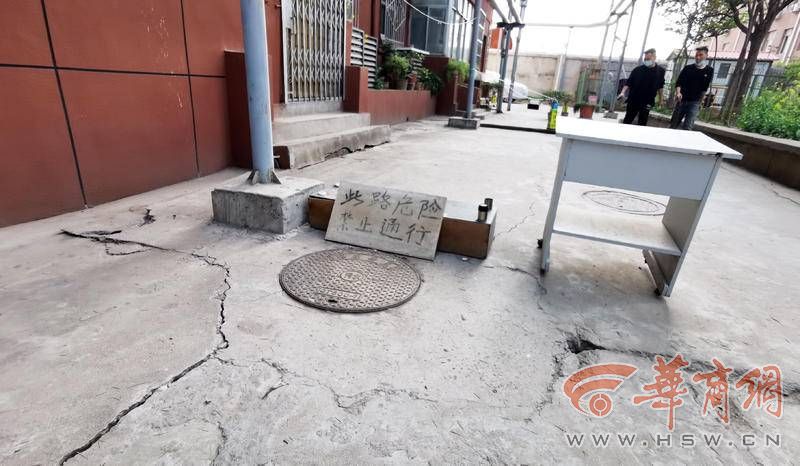 记者看到,4号楼共有6个单元,每栋楼有6层。楼旁的地面有多条裂缝,最明显的一道裂缝沿着墙根蔓延约5米,裂缝宽度约为一厘米,裂缝两侧的地面高度也不同。在裂缝带的周围,居民自发摆放了家具、盆栽等物品,圈出了一片警示区,避免车辆通行。小区内多个井盖也出现损坏,居民在井盖上放置了轮胎、椅子等物品,提醒路人注意脚下。