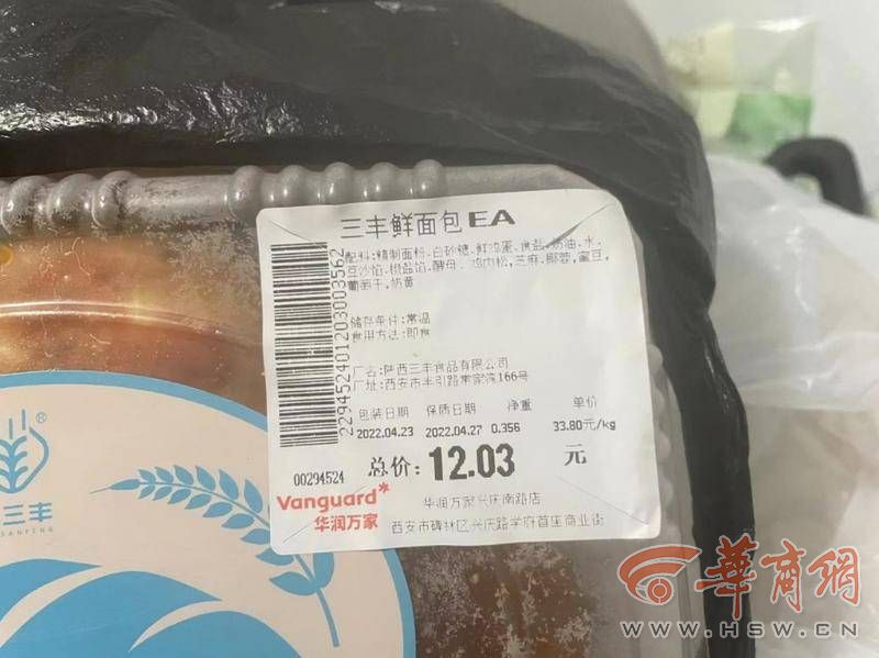 4月25日,华商报记者在郑先生提供的购物小票上看到,郑先生4月23日下午6时43分在华润万家西安兴庆南路店购物,包括两盒称重计价的三丰鲜面包,一盒11.76元、一盒12.03元。郑先生提供价签为12.03元一盒面包里,一块面包上能看到明显的灰绿色霉点。包装盒右上方贴有华润万家的价签,保质期为4月23日-4月27日。