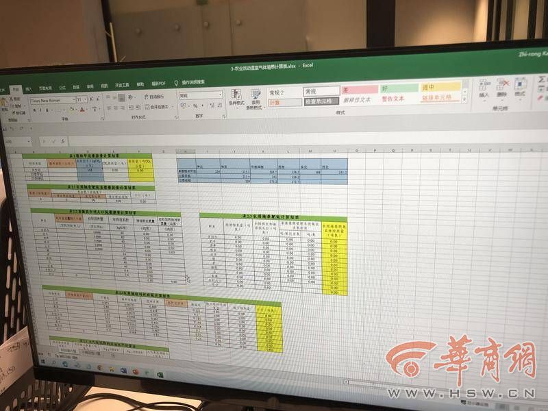 康治蓉打开一个EXCEL表,向记者介绍:“这是计算碳排放的一个模板。”记者看到,是多个并不简单的表格,有很多公式。
