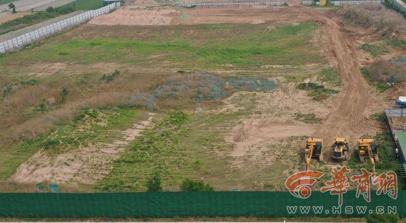 从外面看,没有异常。记者通过航拍镜头看到,园区内的确堆放着很多砂石,还停放着三台挖掘设备,园区东南角,有活动板房。