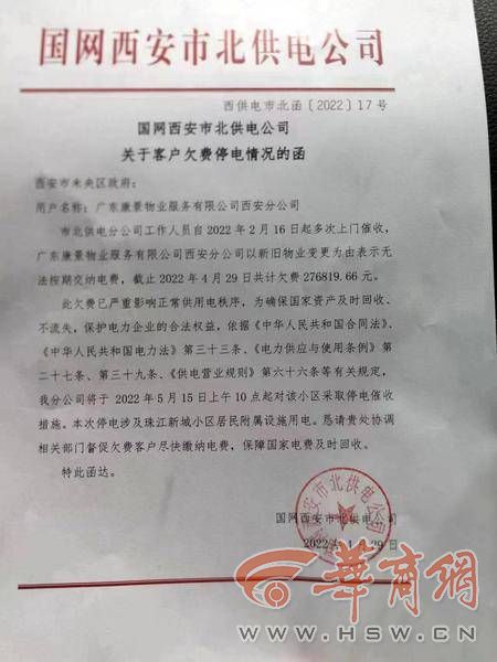 5月16日,西安市未央区珠江新城小区多位业主给华商报新闻热线打电话反映:小区公共区域因欠费被停电,导致电梯用不了,四层以上高区停水,直接影响6000多户人家的生活,希望能尽快恢复供电。