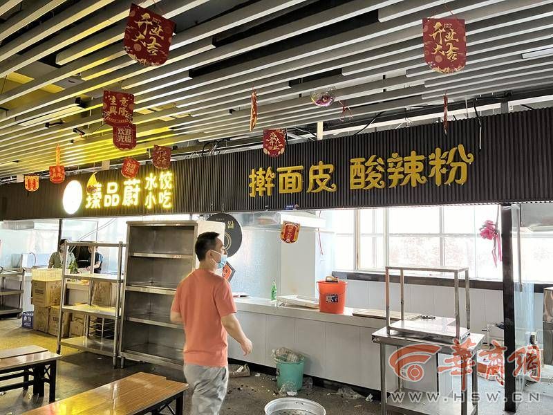 6月6日上午11时许,华商报记者来到联通智慧大厦2楼的悦+共享美食城,美食城内的屋顶装饰着“欢迎光临”的彩条和气球,但内部多家餐饮门店都在清理店内设备,准备搬走。