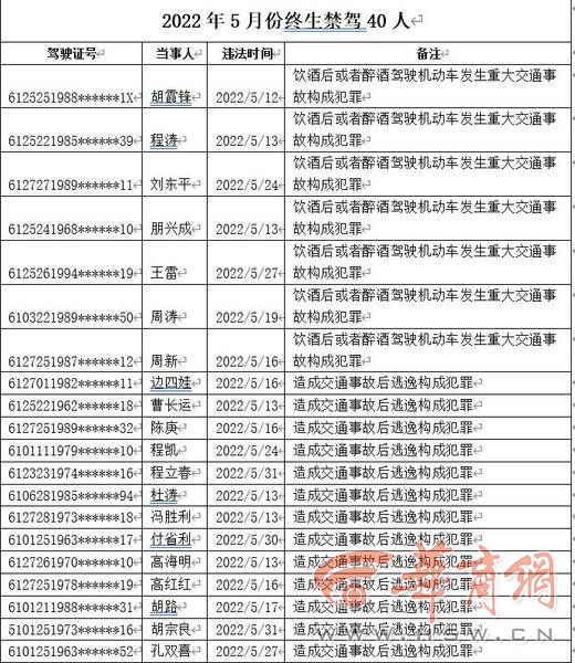近日,华商报记者从省公安厅交警总队了解到,5月份,全省40名驾驶人被终生禁驾。其中,7人因饮酒后或者醉酒驾驶机动车发生重大交通事故构成犯罪,33人因造成交通事故后逃逸构成犯罪。