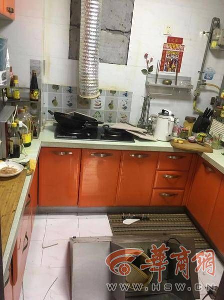 6月14日上午,华商报记者来到李先生家中,掉在地上的吸油烟机仍未挪动,燃气灶上还有掉落的碎砖块和水泥块,墙上两块墙砖已经掉落。李先生和老伴回忆起当时的场景,仍心有余悸,家里墙砖贴了8年了,油烟机用了4年。“要是白天做饭时掉下来,那就砸到人了。约五十斤重的油烟机就用4颗螺丝钉在墙砖缝,螺丝钉一半都在墙外。”