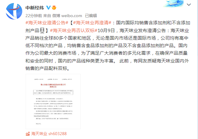 10月9日,海天味业发布澄清公告:海天味业产品销往全球80多个国家和地区,无论是国内市场还是国际市场,公司均有高中低不同档次的产品,均销售含食品添加剂的产品及不含食品添加剂的产品。国内作为公司最大的消费市场,为了满足广大消费者的多元化需求,在确保产品质量和安全的同时,国内的产品线种类更为丰富。 此前,有网友质疑海天味业国内外销售的产品配料双标。