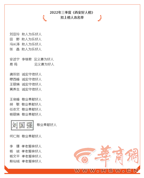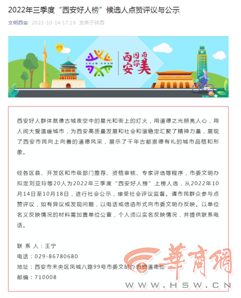 10月14日,西安市文明办进行2022年三季度“西安好人榜”候选人点赞评议与公示,候选人共20人,其中,华商报于8月22日、8月23日连续报道的“酸枣爷爷”黄养生,以“诚实守信好人”上榜。