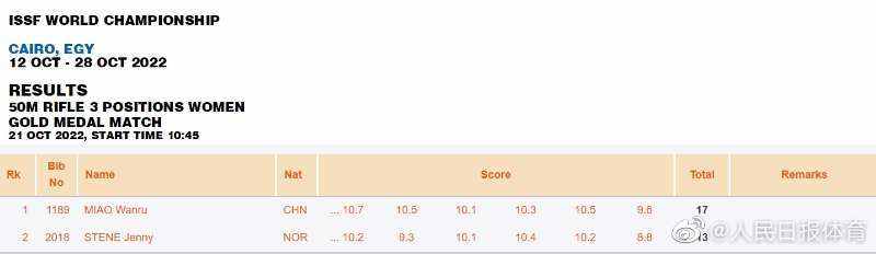 当地时间21日,国际射联射击(步手枪)世锦赛在埃及开罗继续进行。中国选手苗婉茹在当天进行的女子50米步枪三姿比赛中发挥出色,晋级冠亚军争夺赛,并以17:13逆转挪威选手夺冠,为中国射击队获得一张该项目奥运门票。