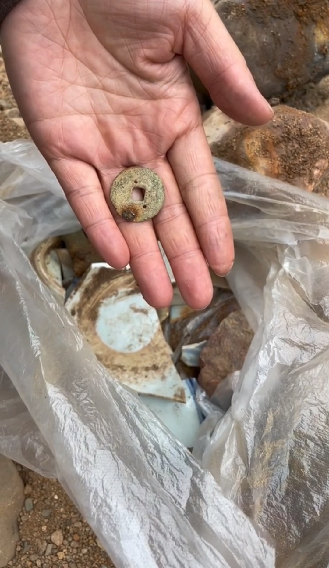 ▲ 市民挖到的铜钱及瓷片(来源网络)
