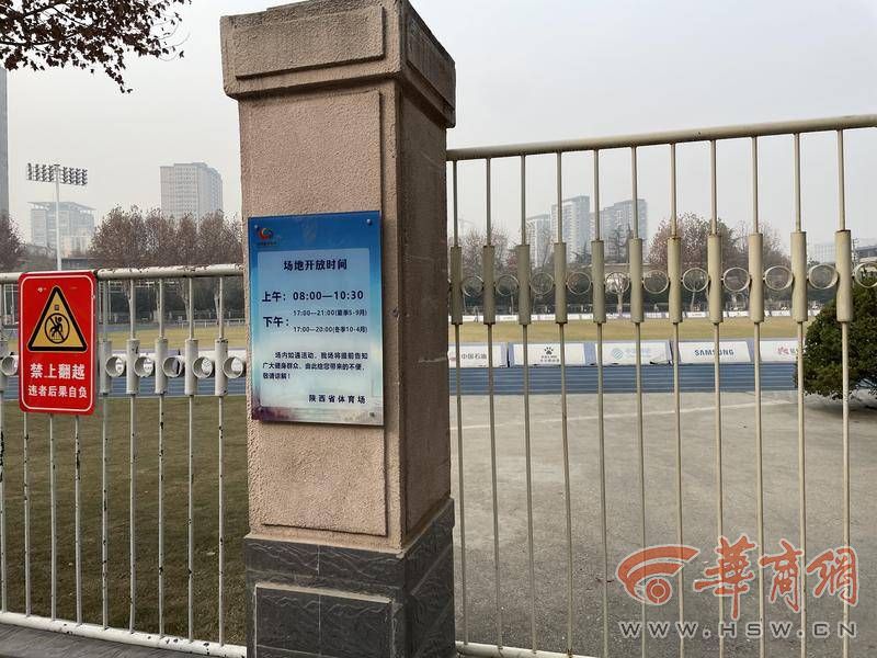 中午,记者来到碑林区的陕西省体育场。这里共有两个11人制足球场,主场与副场的门都关着,副场门外贴着场地开放时间告示牌,每天上午8:00至10:30,下午5:00至9:00开放(冬季结束时间为8:00)。