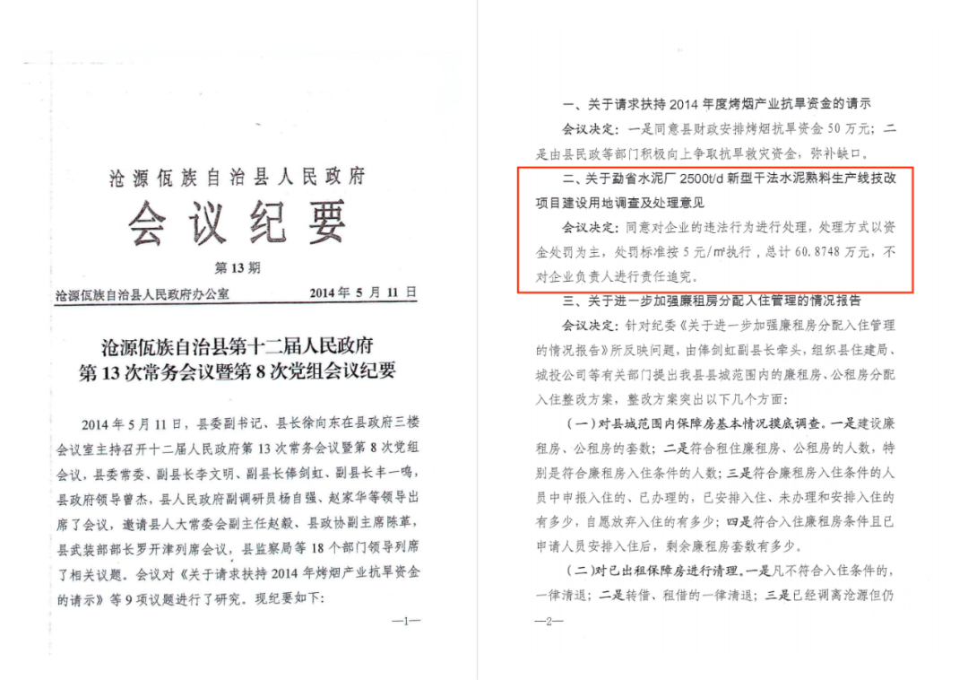 2014年至今,金江水泥矿山开采过程变形走样,超范围开采,长期以修建开采道路和排查整改安全隐患之名,行开采石灰岩之实,在矿权范围外大面积、大范围开采石灰岩矿200余万吨,国有矿产资源流失严重。沧源县自然资源部门针对金江水泥建设生产过程中未批先建、边报边建、非法采矿、非法占用土地等违法行为,仅作出两次行政处罚。