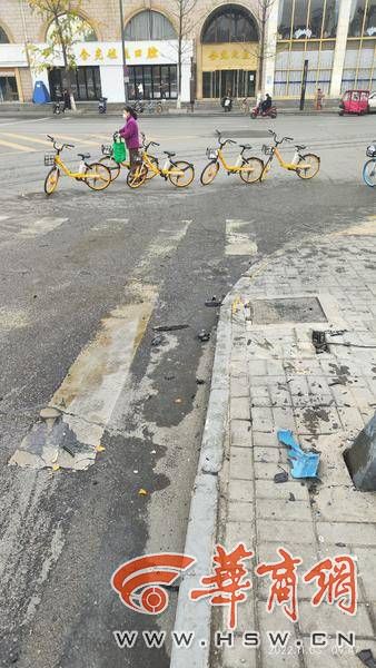 彭师傅说,有油污的地方看着像是用水清洗过,可还是滑,周围也没有任何的警示标识。“滑倒的人多,附近有好心人看到,把路边的共享单车推了几辆放在路口处,这才算有了警示。”
