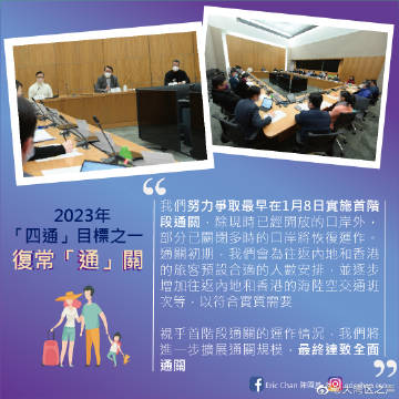 香港特区政府政务司司长陈国基今天(1日)在其社交网站发文称,“通关事务协调组”正分秒必争地拟订稳妥方案以达致逐步、有序、全面“通关”。特区政府同时与中央、粤深政府相关单位密切联系,争取最早在1月8日实施首阶段“通关”。除了现时已经开放的口岸外,部分已关闭多时的口岸将会恢复运作。