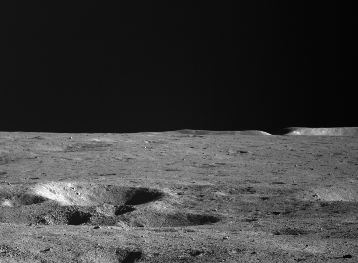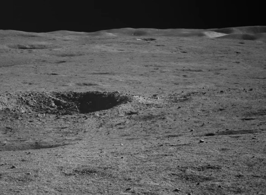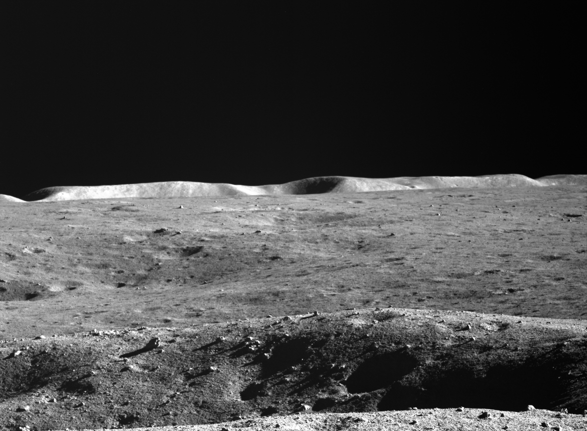 第49月昼期间,当玉兔二号月球车行驶至LE04905点时,全景相机拍摄的撞击坑边缘隆起,远处还可以看到接着天际线的冯卡门坑边缘。