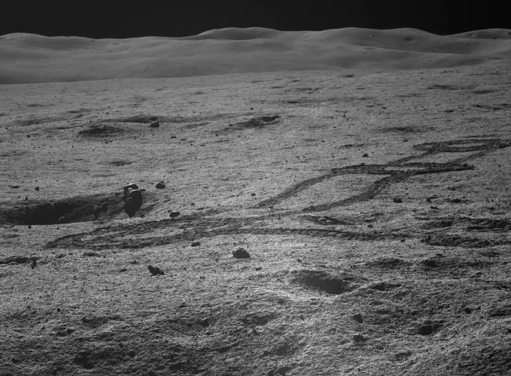 总台央视记者 李宁:可以看到月球的地形地貌坑坑洼洼,路况还是比较差的。这个是玉兔二号已经行驶过的车辙印,它在这个区域进行了一个爬坡,随后它开始进入相对平缓的路段,可以看到非常清晰的车辙印。