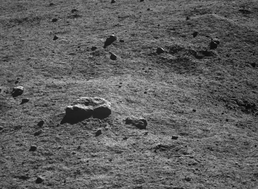 第49月昼期间,在LE04903探测点,全景相机拍摄的紧邻车辙处有一石块。