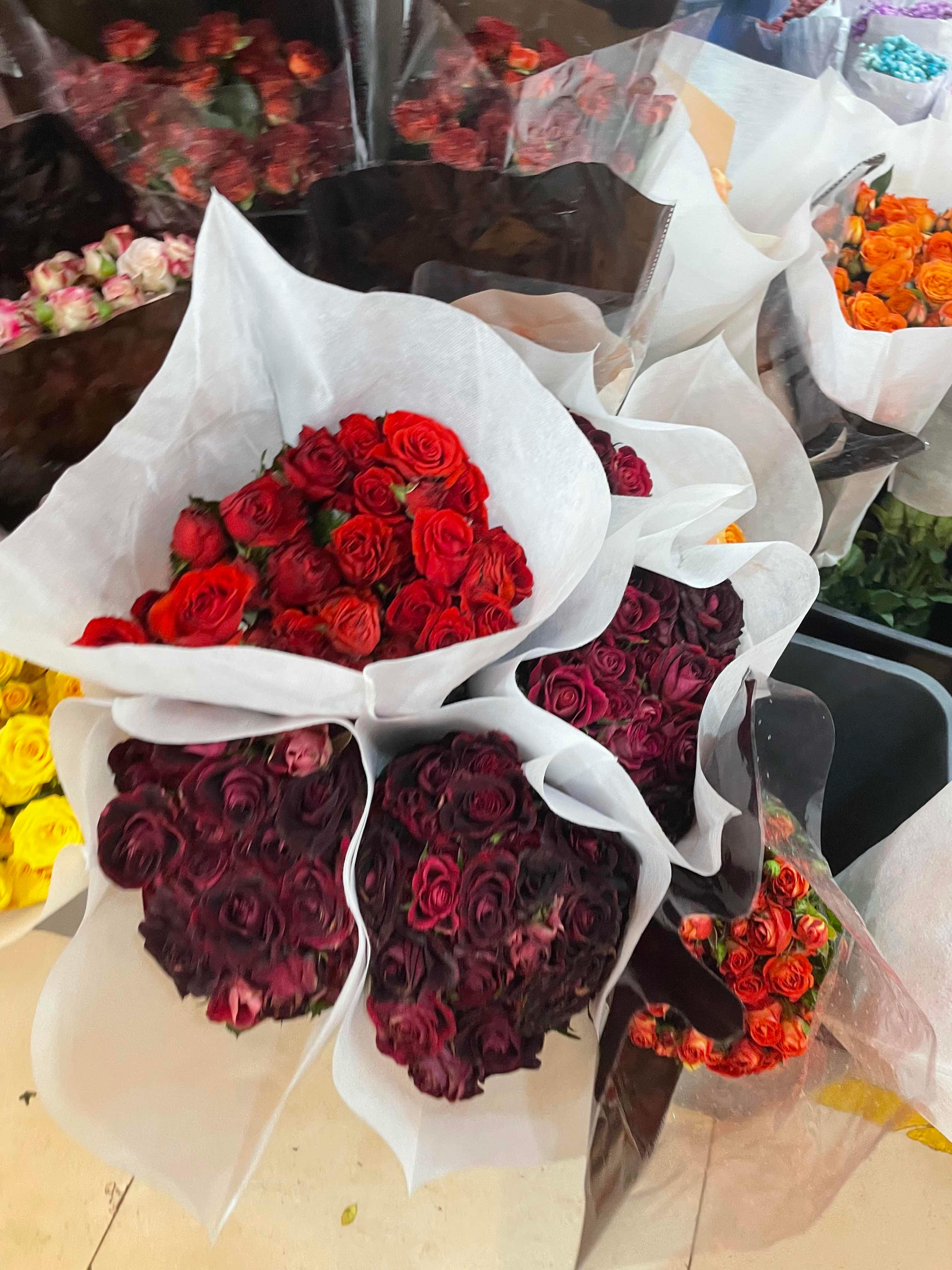 2月7日,澎湃新闻记者在灵石路鲜花批发市场了解到,这里的花大多从云南昆明运到上海,不少商家不按只卖,是按照一束一束卖,价格在60-85元不等。