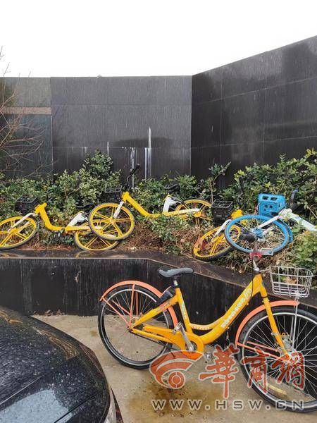 旬邑商会东侧,路边绿化花坛内杂草丛生,草丛里还横七竖八“躺”着七八辆共享单车。