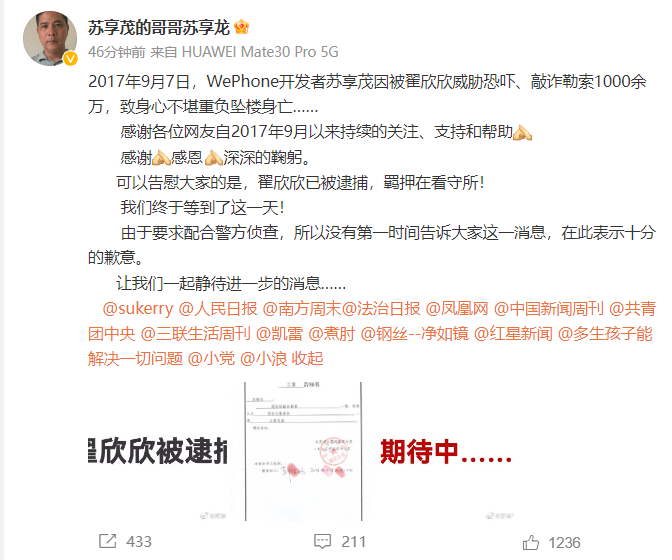 曾备受关注的“WePhone创始人苏享茂自述被前妻翟欣欣逼死案”有了新进展。6月9日,苏享茂的哥哥苏享龙在其微博发文称,收到了北京市公安局海淀分局的立案告知书。