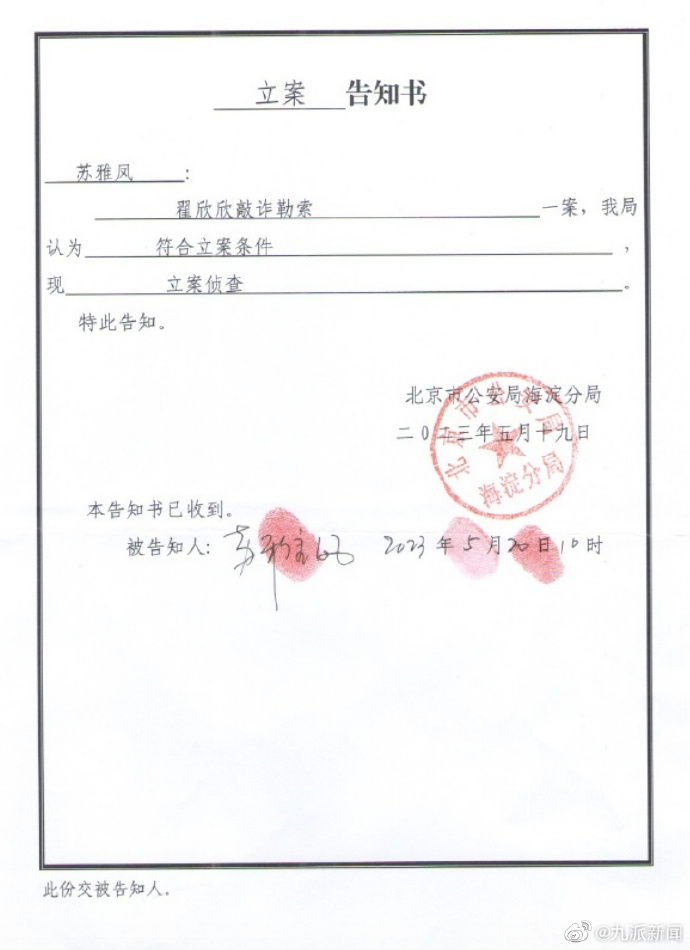 立案告知书显示:翟欣欣敲诈勒索一案,符合立案条件,现立案侦查。