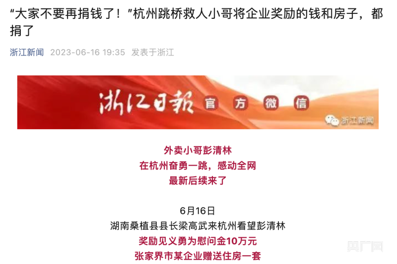 央广网杭州6月17日消息,6月16日,网上有很多关于“浙江跳桥救人的外卖小哥被奖励10万元和一套房子,后都捐了”的报道。6月17日,记者联系上外卖小哥彭清林,向他了解此事。