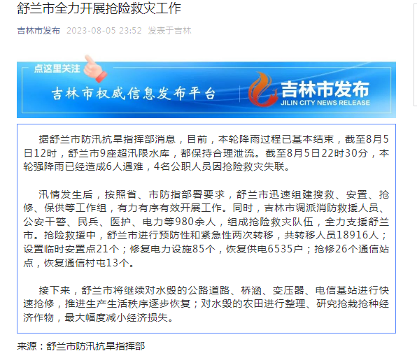 据舒兰市防汛抗旱指挥部消息,目前,本轮降雨过程已基本结束,截至8月5日12时,舒兰市9座超汛限水库,都保持合理泄流。截至8月5日22时30分,本轮强降雨已经造成6人遇难,4名公职人员因抢险救灾失联。