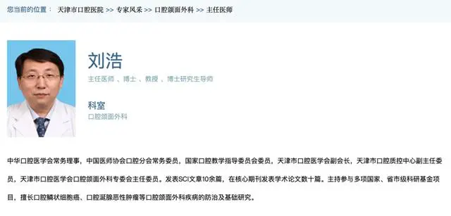▲刘浩个人资料。图片来源/天津市口腔医院网站截图