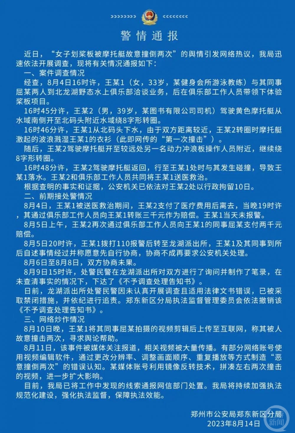 被撞的王女士称,事发地在郑州市北龙湖。王先生驾驶的摩托艇只撞了她一次,她在社交媒体及受访时强调“被撞了两次”的表述不准确。发视频的目的是为引起舆论关注,促成自己被撞事件尽快解决。