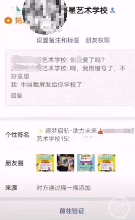 相关截图显示,这个名为“XX星艺术学校”的微信账号,先是发来一条好友申请和一句不雅文字,接着表示:“啊,我用错号了,不好意思。”李女士则回复对方:“截屏发给你学校了!”