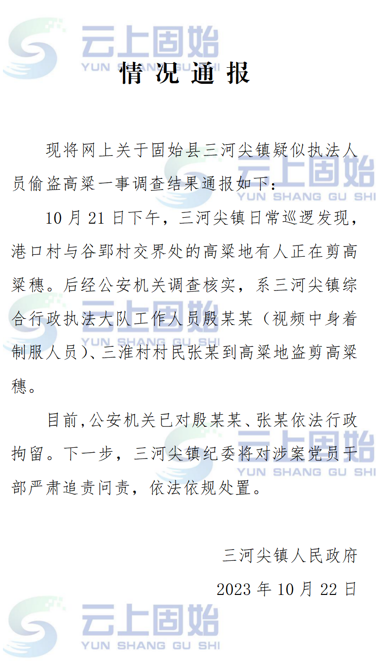 河南固始通报“执法人员带人偷高粱”:两人被行拘 严肃问责