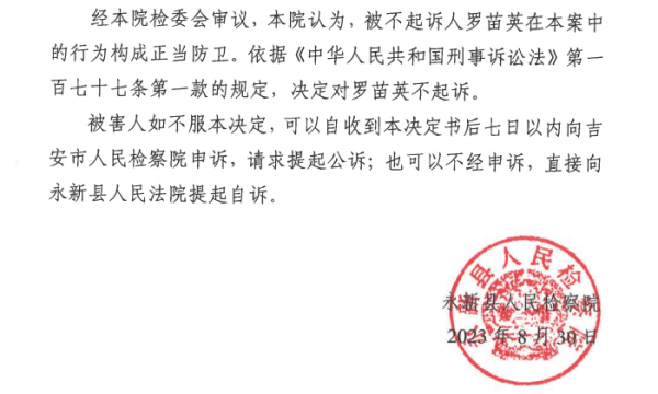 在冲突过程中,刘金华的父亲用拳头欲殴打刘杉园,被刘杉园的妻子罗苗英扯住衣领阻止,后来刘金华父亲被罗苗英抓伤右眼,经鉴定为轻伤二级。2023年8月,永新县检察院认为罗苗英在本案中的行为构成正当防卫,决定对其不起诉。