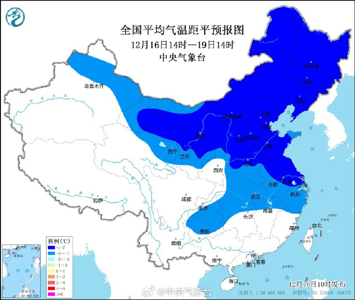 受寒潮和后续冷空气影响,未来一周,我国大部地区气温将持续偏低。预计12月16日14时至19日14时,新疆北部、西北地区中东部、内蒙古、华北地区、东北地区、黄淮、江淮、江汉、江南北部、贵州等地部分地区日最低气温较历史同期偏低5℃以上,其中西北地区东部、内蒙古、东北地区、华北地区、黄淮中东部、江淮中东部等地部分地区日最低气温较历史同期偏低7℃以上,最低气温0℃线将位于贵州南部至江南北部一带。