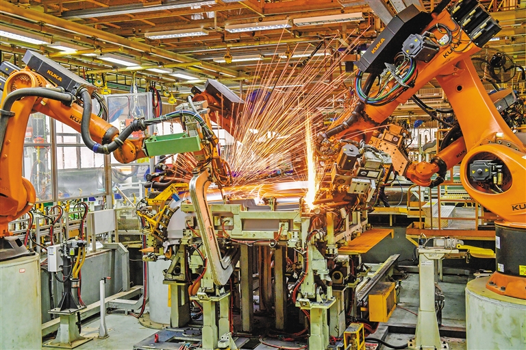12月15日,在陕汽西安商用车产业园车身厂,工业机器人在焊接作业。