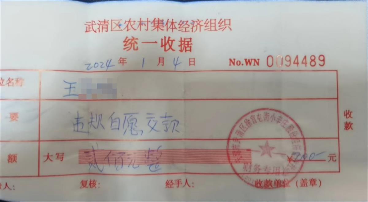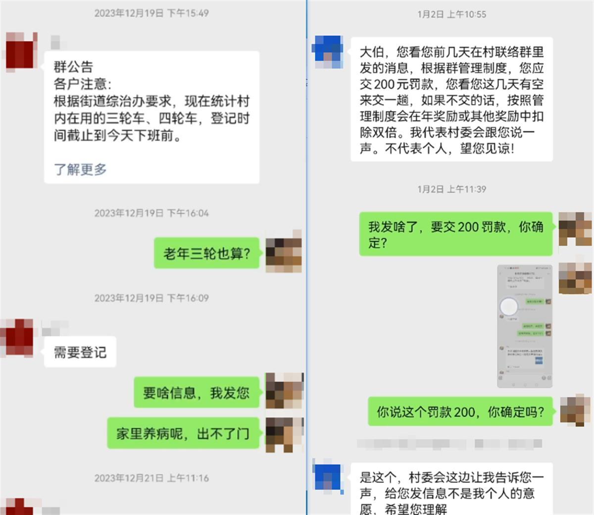 1月2日,村委会工作人员提醒王先生,因前几天在村联络群里发消息,根据群管理制度,他要交200元钱。他感到不解,于是他托人和村里的范姓负责人沟通,沟通结果还是必须交罚款,“没办法,就把钱交了,村里还给开了收据。”