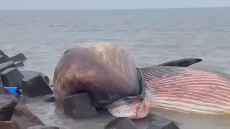 相关视频显示,某处岸边有一头搁浅的鲸鱼,有几名工作人员正在现场处置。