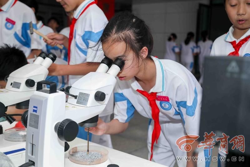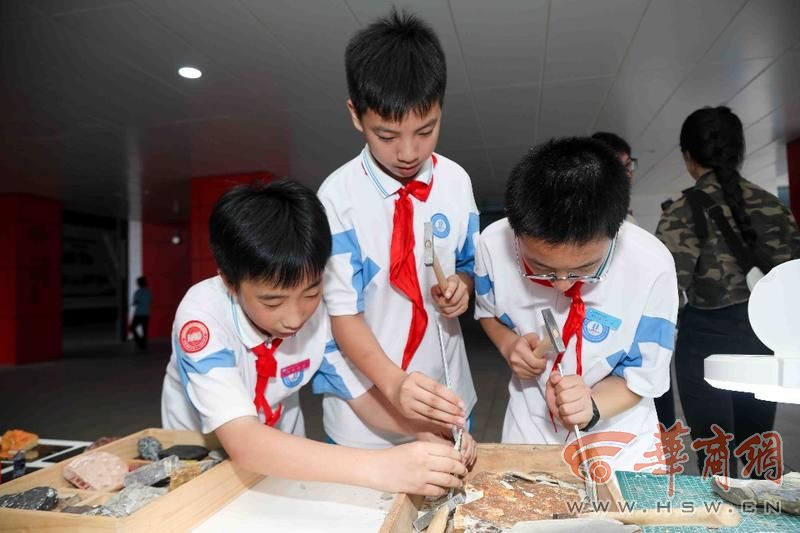 启动仪式前,西北大学地质学系的“DR.EARTH移动博物馆”来到了高新十一初的校园,现场展示了构造模型、岩石与矿物、古生物化石等,孩子们在科普志愿者的引导下聆听知识讲解,并体验了化石挖掘、化石修复和岩石薄片观察等实验过程。