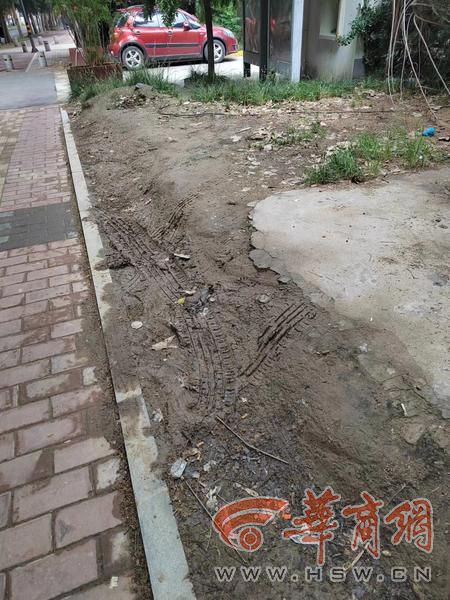 6月3日上午,华商报大风新闻记者来到丈八西路与丈八六路十字西侧,看到丈八西路国家电网围栏外绿化带的土地上停了一辆机动车,周边土地表面有多条车轱辘印记;机动车停放的绿地内有两组国家电网的配电箱,箱体一侧挂着:高压危险严禁靠近的提示牌;沿着车辆驶入的印记,记者看到西侧人行道豁口处设置了一个隔离墩,但由于人行道与绿化带之间没有阻挡,机动车从旁边的部分人行道和绿化带驶入停放;丈八南社区大门外对面的人行道上也有机动车与一辆快递车并排占道停放。另,丈八南社区大门外道沿下有多辆机动车占道停放,影响通行。