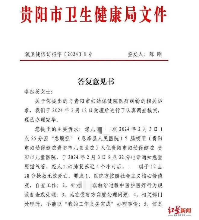 6月7日,贵阳市妇幼保健院法规科等部门回复红星新闻,他们对琪琪的去世表示痛心,但作为当事单位,他们不宜对医生的医疗行为作出评价。据悉,该院曾建议家属走医调委或医疗事故鉴定委员会的相关程序。贵阳市卫生健康局的一份《答复意见书》显示,就李忠英反映的问题,该局已责成贵阳市妇幼保健院“妥善处理”。